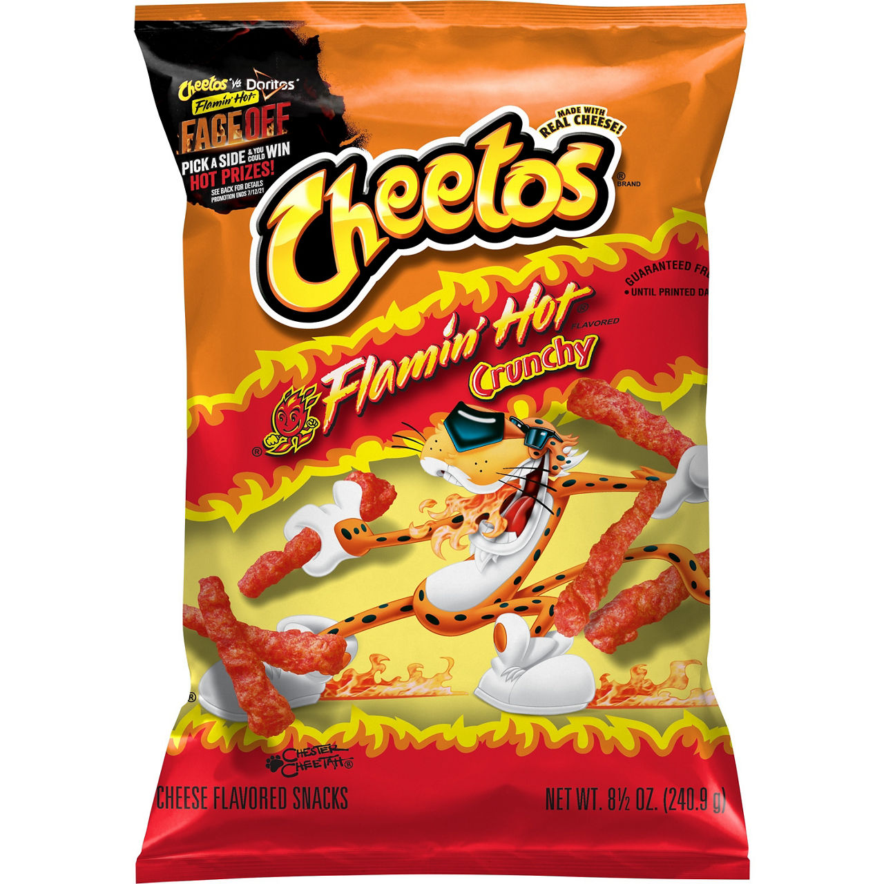 Cheetos Crunchy Xxtra Flamin' Hot Cheese Snacks Cheetos Crunchy Xxtra Flamin' Hot Cheese Snacks. 8.5 oz. $4.10 ($0.49/oz) Product description. CHEETOS snacks are the much-loved cheesy treats that are fun for everyone! You just can't eat a CHEETOS snack without licking the 'cheetle' off your fingertips. And wherever the CHEETOS brand and CHESTER CHEETAH go, cheesy smiles are sure to follow.
