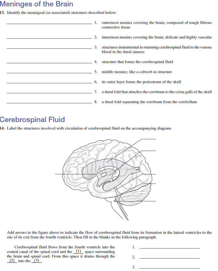 Lab 12 2 - Question 1 of 6 (see Question 14, p. 302 in Lab... - Course Hero median foramen, lateral foramen or central canal (in any order)g. subarachnoid space h. arachnoid villii. dural sinuses Question 2 of 6 (see Question 14, p. 302 in Lab Manual) Now label appropriately the structures involved with circulation of cerebrospinal fluid on the accompanying diagram. (These structures are identified by leader lines.) Solved > 13.Identify the meningeal (or associated) structures described ... 14.Label the structures involved with circulation of cerebrospinal fluid on the accompanying diagram. Add arrows to the figure above to indicate the flow of cerebrospina... 15.Using the terms below, correctly identify all structures indicated by leader lines on the diagram. a.abducens nerve (VI) b.accessory nerve (XI) c.cerebe...