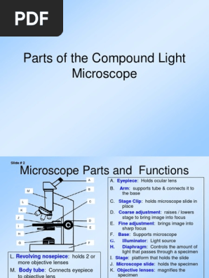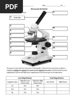 Parts of the Microscope Printables - ThoughtCo 06/10/2009 · Parts of a Microscope Beverly Hernandez Use this study sheet to introduce students to the basic parts of a microscope and how they function. From the eyepiece and light source to the base, students need to know how the parts fit together and why they're important. Microscope Vocabulary Beverly Hernandez PDF Parts of the Microscope Study Sheet A study sheet to learn the parts of the microscope. 1.Eyepiece Combination of lenses at the viewing end of optical instruments 2.Nosepiece Holds two or more objective lenses and can be rotated to change power 3.Adjustment knob Located on the side of the frame, used to adjust the focus of the microscope Labeling the Parts of the Microscope Labeling the Parts of the Microscope This activity has been designed for use in homes and schools. Each microscope layout (both blank and the version with answers) are available as PDF downloads. You can view a more in-depth review of each part of the microscope here. Download the Label the Parts of the Microscope PDF printable version here.