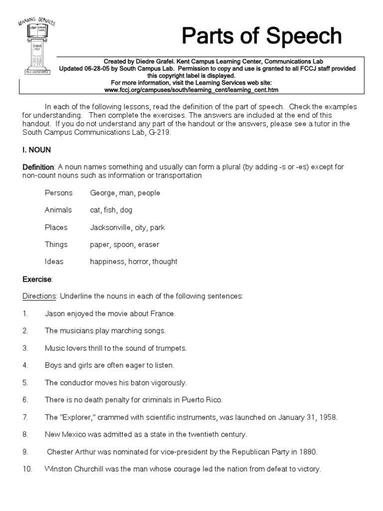 Lesson Plan: Label Sentences with Parts of Speech - ThoughtCo This lesson plan focuses on helping beginning level classes develop a strong grasp of four parts of speech: nouns, verbs, adjectives, and adverbs. Once students become familiar with common structural patterns using these four key parts of speech, they feel more confident as they begin to explore the different tenses. Lesson Characteristics