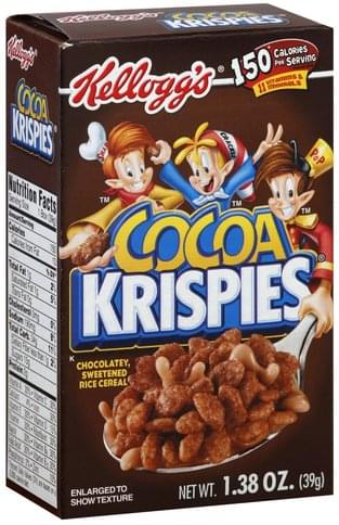 Kellogg's® Cocoa Krispies® cereal - SmartLabel™ Kellogg's® Cocoa Krispies® cereal. 15.5 oz. 00038000198595. Nutrition . Ingredients . Allergens . Features & Benefits . Company, Brand & Sustainability . 160. Calories. 1 g. Sat Fat. 150 mg. Sodium. 15 g. Sugar. Nutrition Facts. Servings Per Container About 11. Serving Size 1 Cup (40 g) Amount Per Serving Cereal with 3/4 cup skim milk; Double Chocolate Chip Cookies - Allrecipes Sift in the flour, baking soda, salt, and cocoa powder; mix well. Stir in the chocolate chips. Roll tablespoonfuls of cookie dough into balls and place them 1 inch apart onto the prepared cookie sheets. Cereal (Kellogg's Cocoa Krispies) nutrition facts and analysis. Cereal (Kellogg's Cocoa Krispies) contains 159 calories per 41 g serving. This serving contains 1.1 g of fat, 1.9 g of protein and 36 g of carbohydrate. The latter is 16 g sugar and 0.6 g of dietary fiber, the rest is complex carbohydrate.