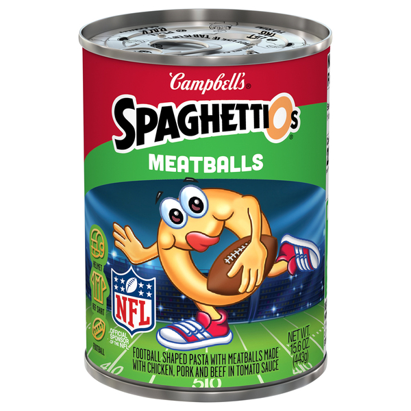 SpaghettiOs® with Franks - Campbell Soup Company This canned pasta puts a spin on original SpaghettiOs® with the addition of savory meatballs. One cup of microwave pasta has 1/2 cup of vegetables and 11 grams of protein for a healthy snack or lunch. Make this canned food when you're craving tasty snacks. Spaghettios Nutrition Facts - Eat This Much 173.9 Calories 31g Carbs (28g net carbs) 2g Fat 8g Protein No price info Try our free Diet Generator I want to eat calories in meals. I like to eat Generate Not the food you're looking for? Try these: Spaghettios Campbell soup company, spaghettios original Spaghettios Campbell soup company, spaghettio's with sliced franks Spaghettios