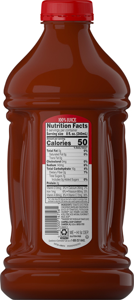 Tomato Juice - Campbell Soup Company No matter how you enjoy it, Campbell's Tomato Juice provides the rich, smooth flavor that makes it America's top tomato juice. Less salt, great taste. ... Nutrition Facts & Ingredients Nutrition Facts: 1 Servings Per Container: Serving size: 1 Can: Amount per serving: Calories 70 % Daily Value * Total Fat: 0g: 0%: Saturated Fat: 0g: 0%: Trans ...