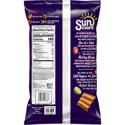 SUNCHIPS® Chili Lime Bag of SUNCHIPS® Chili Lime ... Peppers and Lime come together on a delicious Whole Grain chip for the Perfect Balance of Citrus and Spice. Nutrition Facts. SUNCHIPS® French Onion Flavored Whole Grain Snacks Nutrition Facts ; Calories, 140 ; % Daily Value* ; Total Fat 6g, 8% ; Saturated Fat 0.5g, 3% ; Trans Fat 0g. Calories in Whole grain Chips, Original from Sun ... - Nutritionix 28 Jun 2022 — Whole grain Chips, Original ; Total Fat · 8% Daily Value ; Saturated Fat 0.5 · 3% Daily Value ; Trans Fat ; Cholesterol · 0% Daily Value ; Sodium 110 · 5 ...
