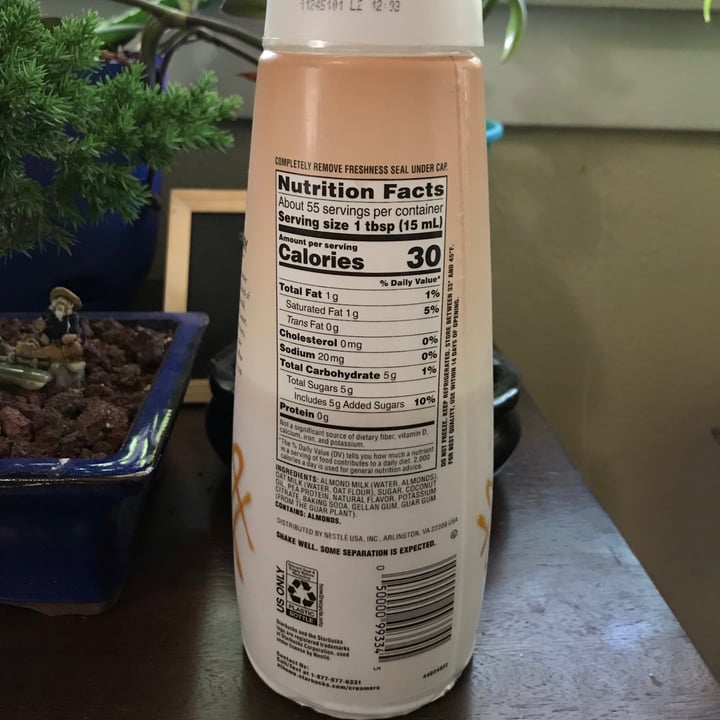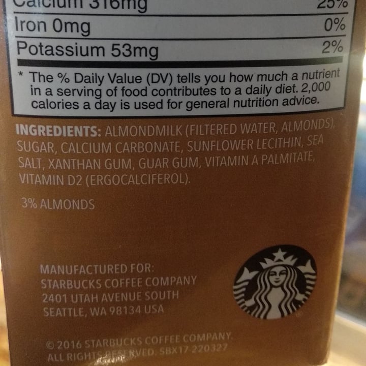 Calories in Starbucks Almond Milk and Nutrition Facts - FatSecret Jul 1, 2022 · Almond Milk Nutrition Facts Serving Size 1 cup (8 oz) Amount Per Serving Calories 60 % Daily Values* Total Fat 4.00g 5% Saturated Fat 0.000g 0% Trans Fat 0.000g Cholesterol 0mg 0% Sodium 100mg 4% Total Carbohydrate 6.00g 2% Dietary Fiber 1.0g 4% Sugars 5.00g Includes 4.00g Added Sugars 8% Protein 2.00g Vitamin D 5mcg 25% Calcium 316mg 24% Iron