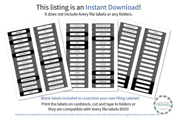 Amazon.com: File Cabinet Label Holders 1-48 of over 1,000 results for "file cabinet label holders" Results Price and other details may vary based on product size and color. 300 Pieces Magnetic Label Holders Channel Labels Racks Magnetic Data Card Holders with Protective Films and Replacement Strips for Metal Shelf, Filing Cabinet, Mailbox, Whiteboard (1 x 3 Inch) 3.5 (8) $4399 38+ Free File Folder Label Templates (How to Make Labels in Word) Creating Labels in Word Step 1: Click "Labels", which appears in the Create group, on the Mailings tab. Step 2: Click "Options", leaving the address box blank. Step 3: In the Options dialog box, select the type of printer you are using. File Cabinet Labels - Etsy Filing Cabinet Labels (1) $2.99 Syrup Label Template | Oil and Vinegar | Custom Sticker Labels | Kitchen Organization | Modern Minimalist Labels | Printable Labels (44) $6.00 Vintage Metal & Leather Printable Junk Journal Label Tags, Fussy Cut Bookplate Scrapbook Embellishment Ephemera, Filing Cabinet Label (3.2k) $1.63 Filing Cabinet Labels $7.00 File Folder Labels | Avery.com File Folder Labels; 100% Satisfaction Guaranteed. Fast Delivery. Free Shipping Over $50. File Folder Labels. items. FILTER . SORT BY: Most Popular . Most Popular Price: Low - High Price: High - Low Product #: Low - High Product #: High - Low Product Name: A - Z Product Name: Z - A . Grid View. List View.