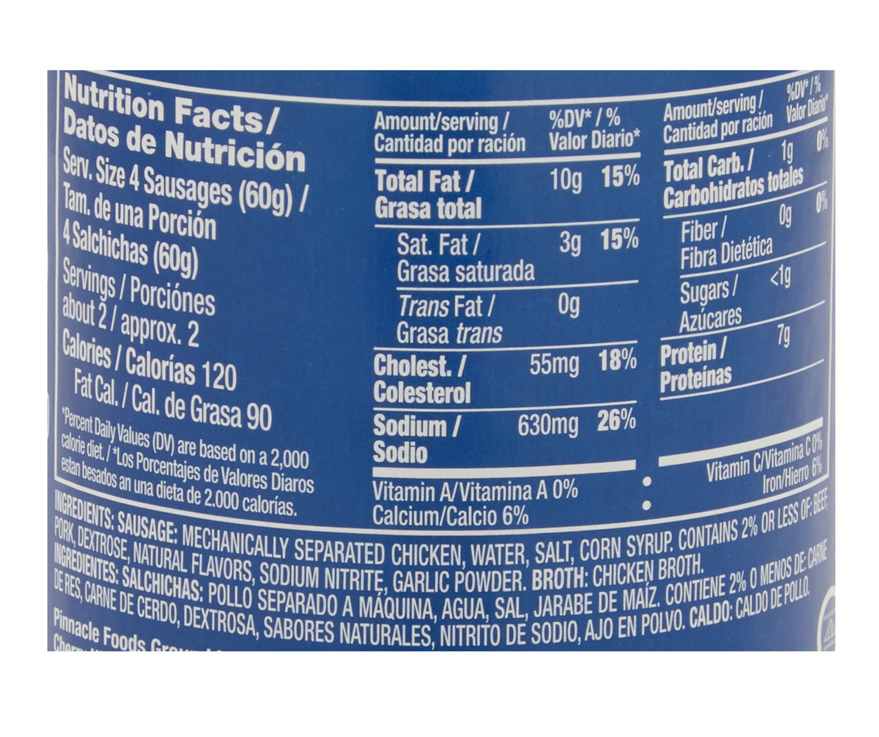 › vienna-sausage,100067Vienna Sausage Nutrition Facts - Eat This Much Vienna Sausage Canned - Great Value Report a problem with this food Find on Amazon Percent calories from... Quick stats 104 Calories 1g Carbs (1g net carbs) 8.3g Fat 5.2g Protein No price info Try our free Diet Generator I want to eat calories in meals. I like to eat Generate Not the food you're looking for? Try these: Vienna Sausage, canned › foods › Vienna+Sausage+OriginalCalories in Armour Vienna Sausage, Original - Nutritional ... Vienna Sausage, Original from Armour Notes: Original Additional Serving Size Recommendations Nutrition Facts Serving Size 50 grams Amount Per Serving Calories 110 Calories from Fat 90 % Daily Value * Total Fat 10g 15% Saturated Fat 3g 15% Trans Fat 0g Cholesterol 45mg 15% Sodium 490mg 20% Potassium 0mg 0% Total Carbohydrate 1g 0% Dietary Fiber