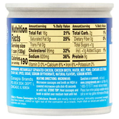 › food › vienna-sausageCalories in Vienna Sausage - Nutritionix Nutrition Facts Vienna Sausage Serving Size: sausage (7/8" dia x 2" long) (16g ) Amount Per Serving Calories 37 Calories from Fat 28 % Daily Value* Total Fat 3.1g 5 % Saturated Fat 1.1g 6 % Polyunsaturated Fat 0.2 g Monounsaturated Fat 1.5 g Cholesterol 14mg 5 % Sodium 141mg 6 % Potassium 16mg 0 % Total Carbohydrates 0.4g 0 % Dietary Fiber 0g 0 %